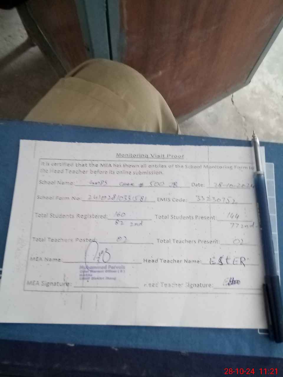 | Attendance Register | Head Teacher | MEA with School | Visit Proof |