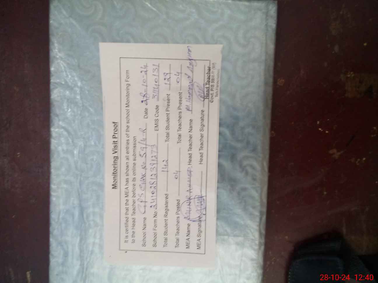 | Attendance Register | Head Teacher | MEA with School | Visit Proof |