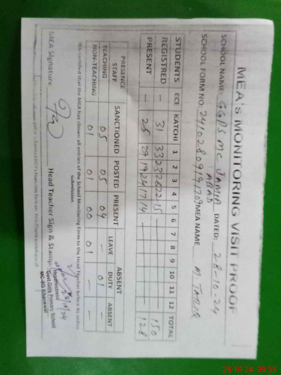 | Attendance Register | Head Teacher | MEA with School | Visit Proof |