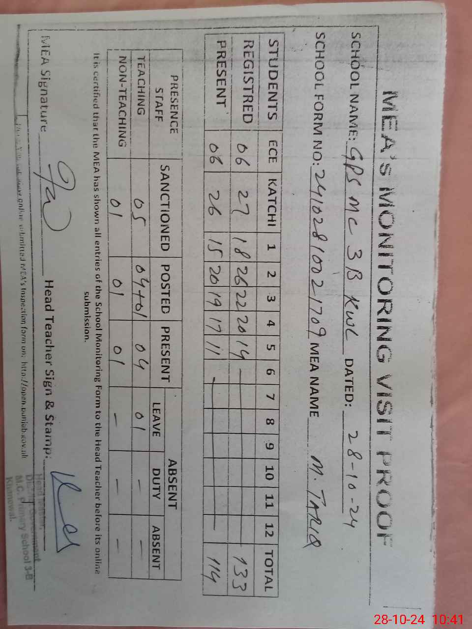 | Certified that this School was Inspected by the Undersigned MEA/DMO Today and the Information Stated Above is as Per Record. | |||||