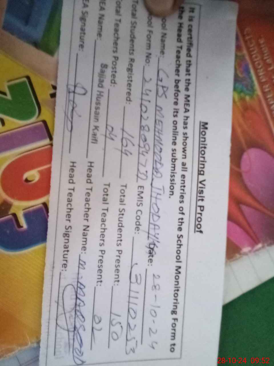 | Attendance Register | Head Teacher | MEA with School | Visit Proof |