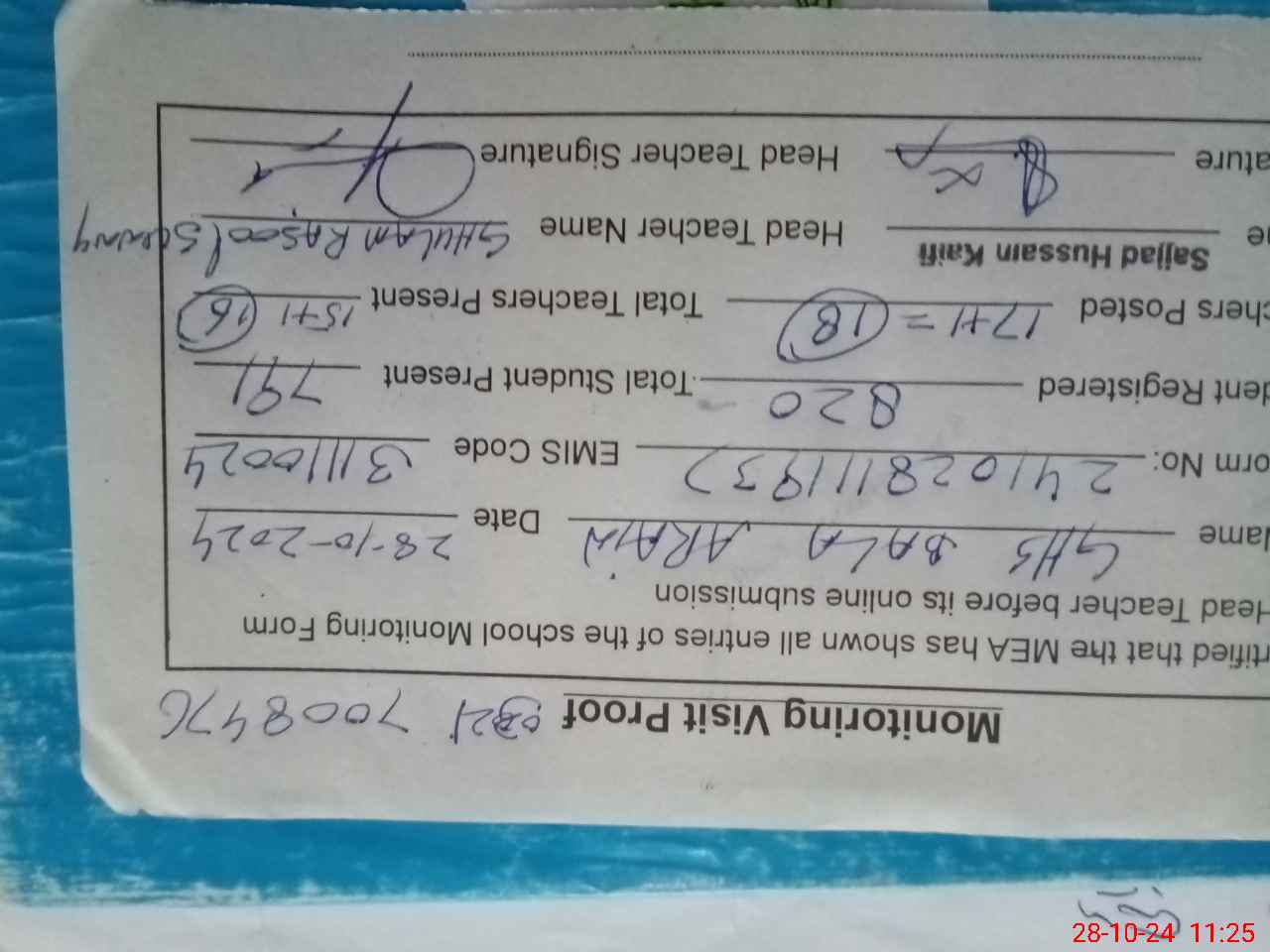 | Attendance Register | Head Teacher | MEA with School | Visit Proof |