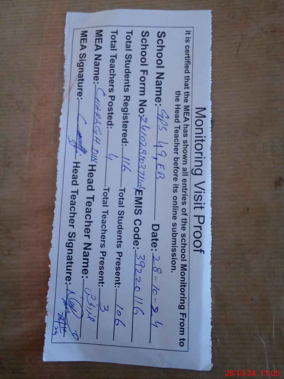 | Attendance Register | Head Teacher | MEA with School | Visit Proof |