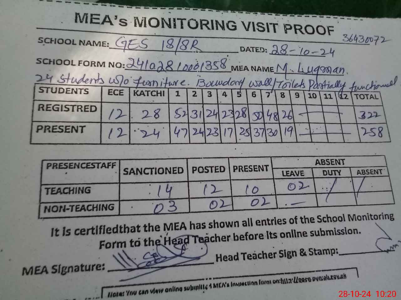 | Attendance Register | Head Teacher | MEA with School | Visit Proof |