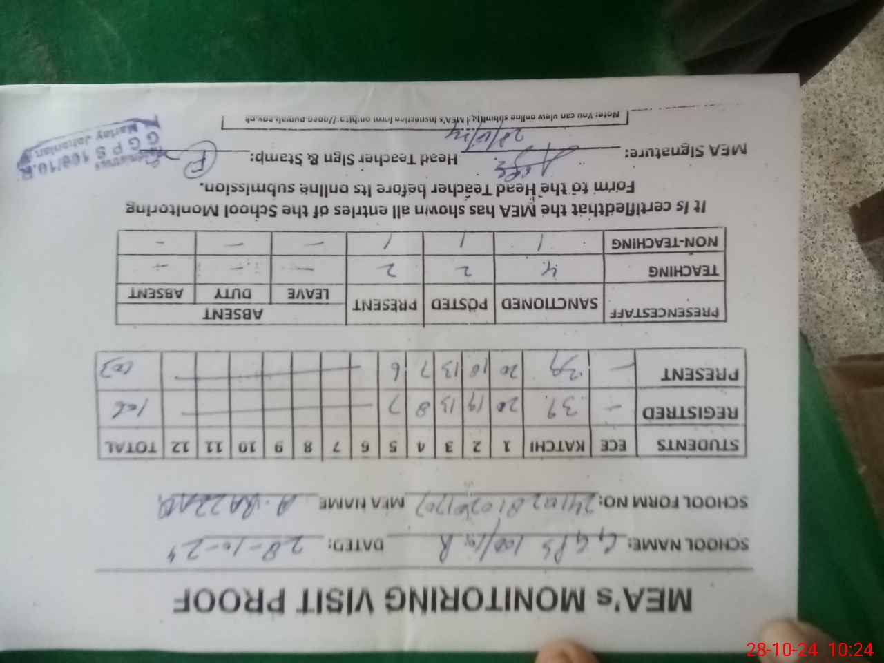 | Attendance Register | Head Teacher | MEA with School | Visit Proof |