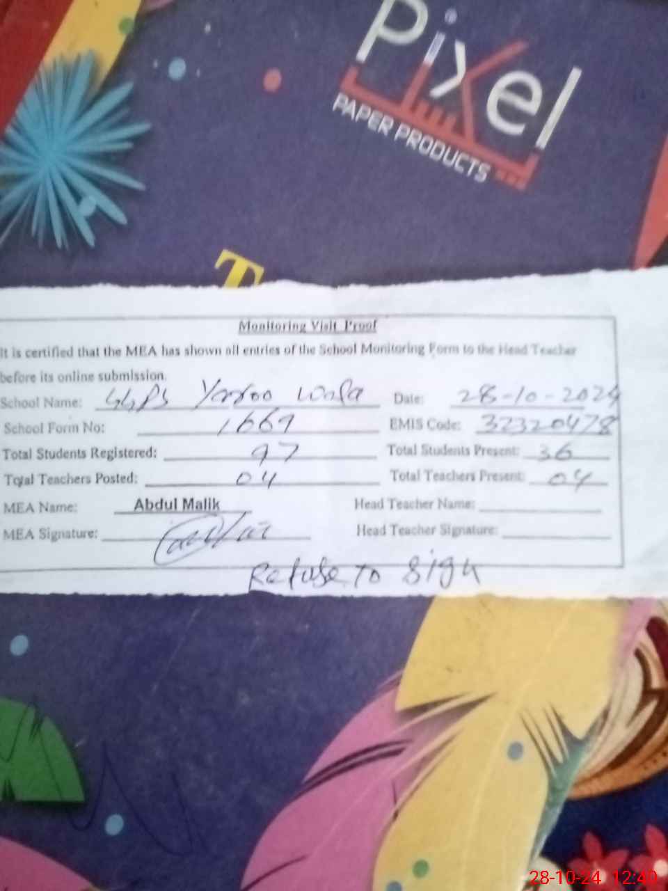 | Attendance Register | Head Teacher | MEA with School | Visit Proof |