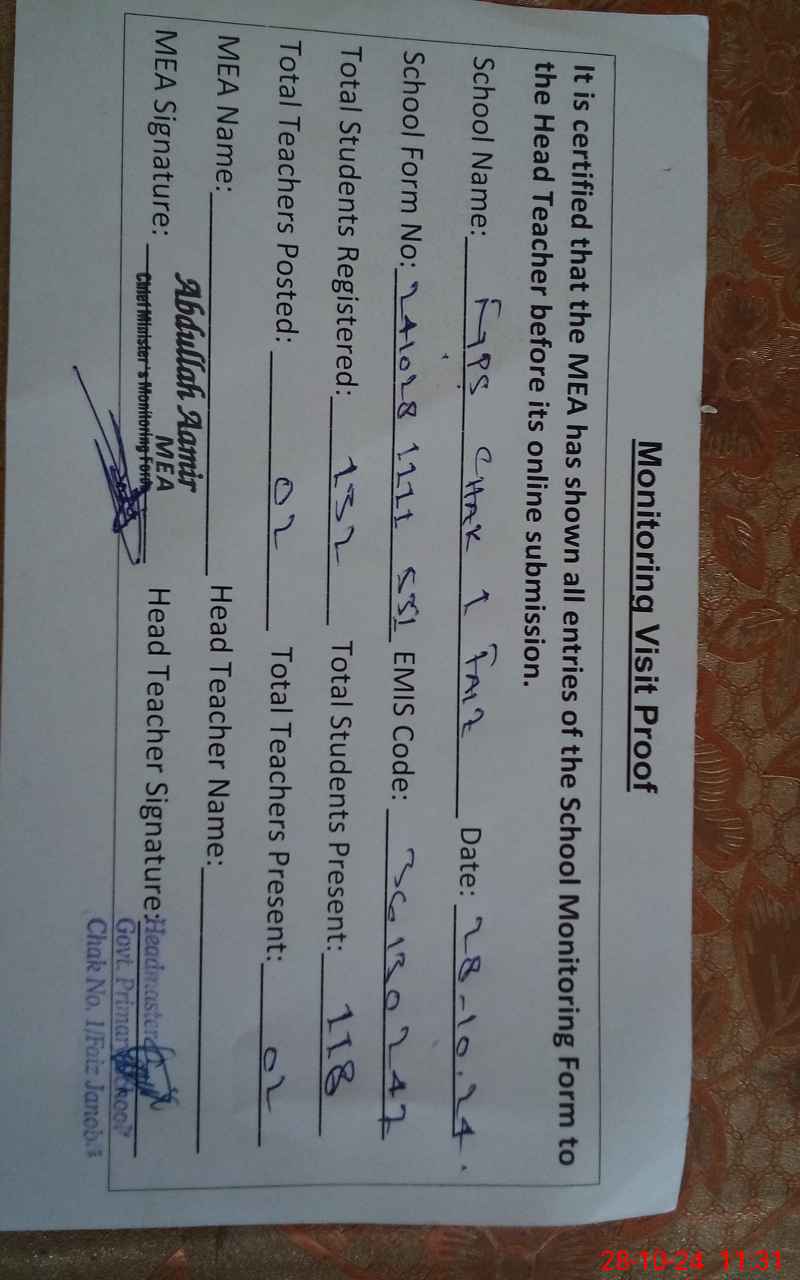 | EMIS Code: 36130247 | Name of School: GPS CHAK NO. 1 FAIZ SOUTH | |||