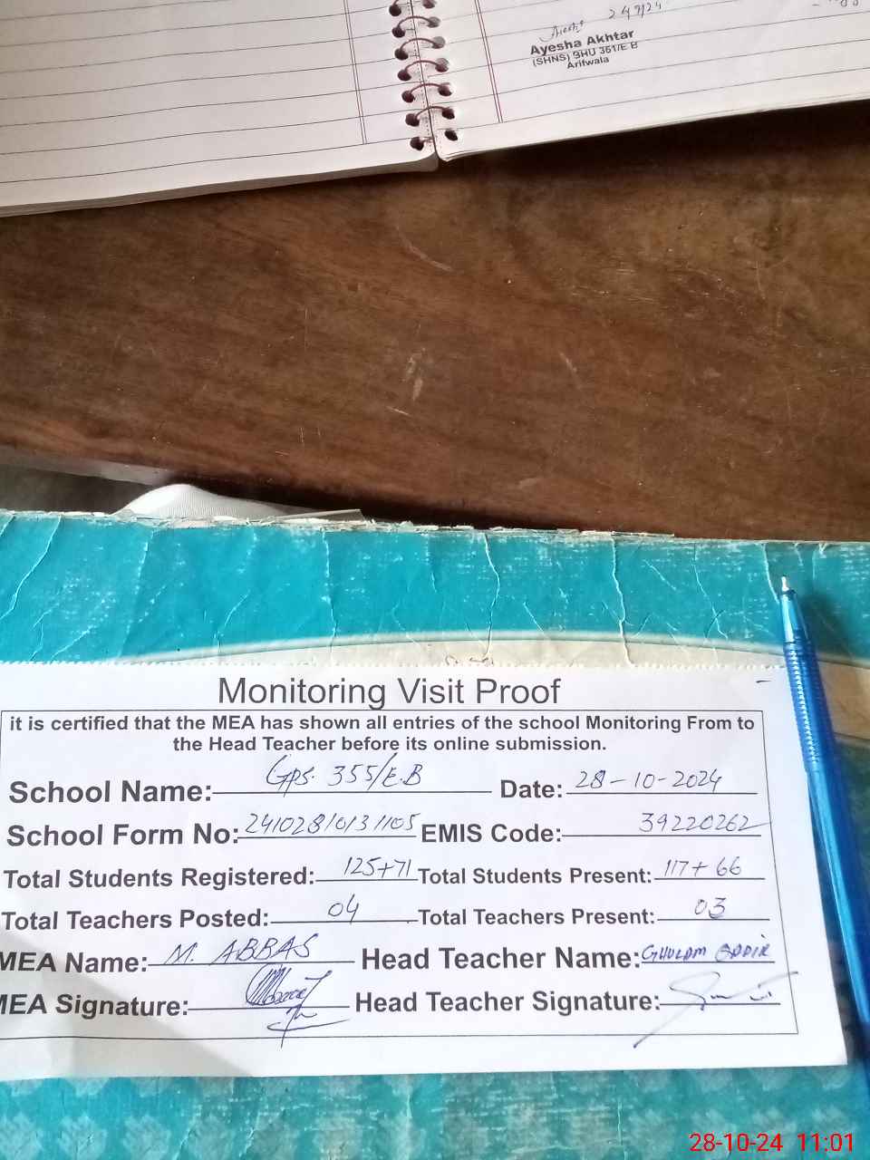 | Attendance Register | Head Teacher | MEA with School | Visit Proof |