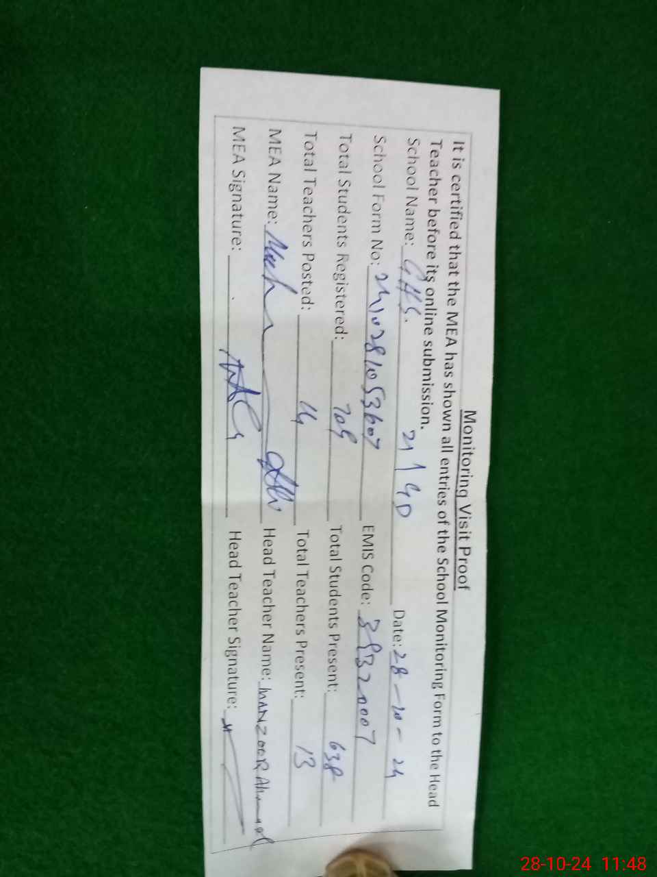 | Attendance Register | Head Teacher | MEA with School | Visit Proof |