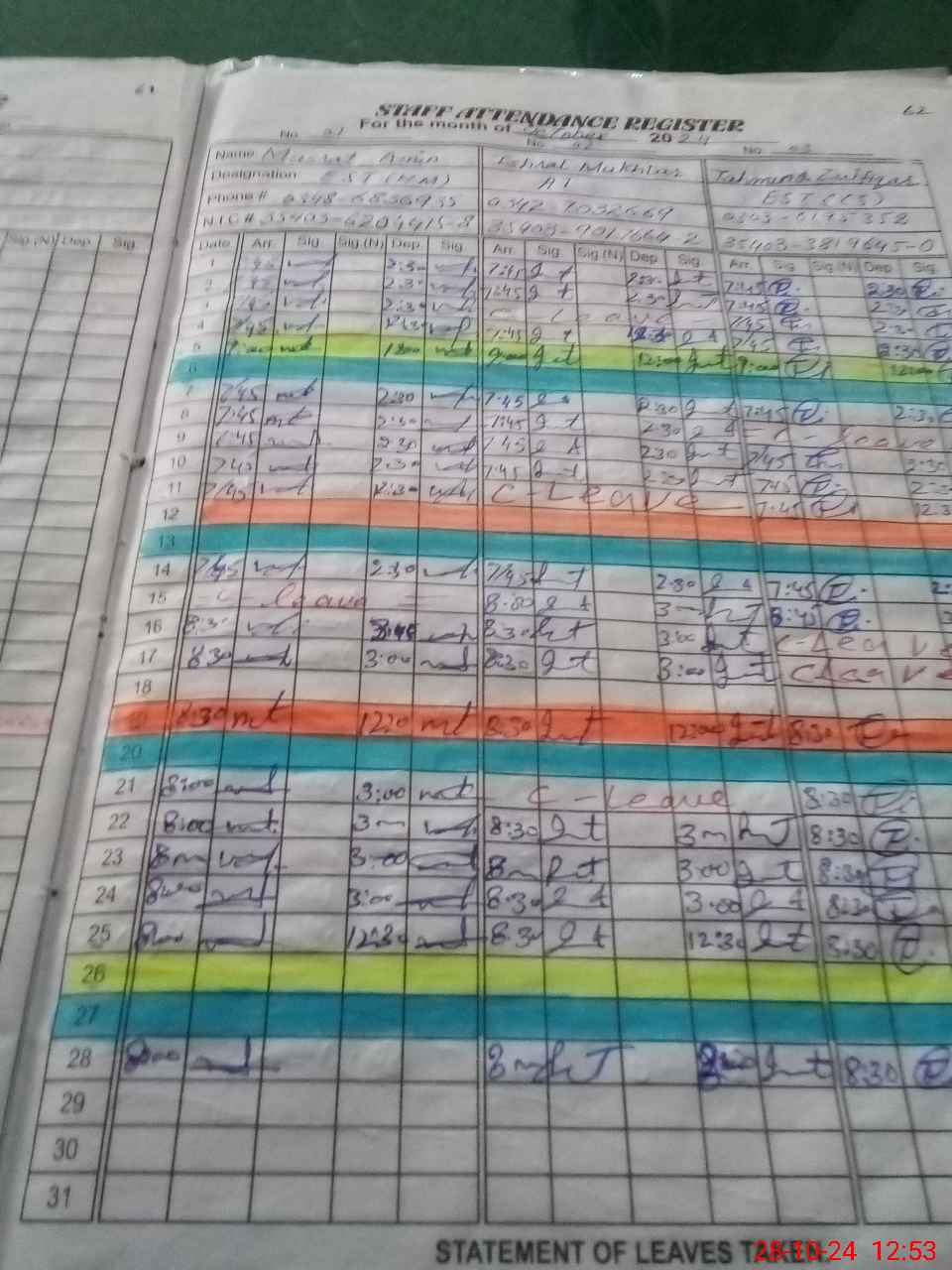 | CNIC | Full Name | Designation | R/C | Absence During Last Calender Month |