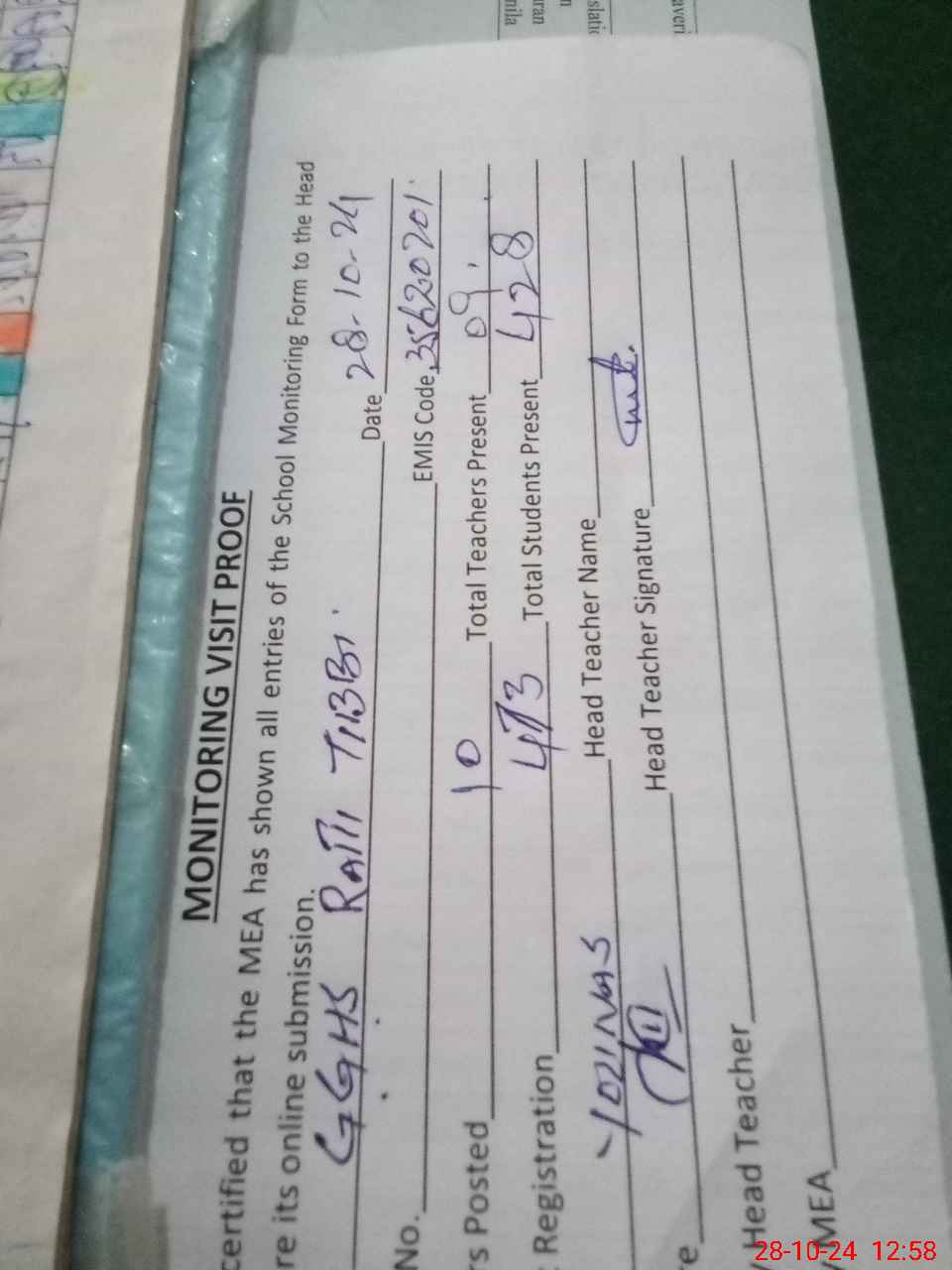 | Attendance Register | Head Teacher | MEA with School | Visit Proof |