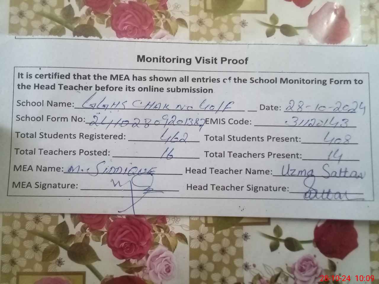 | EMIS Code: 31120143 | Name of School: GGHS CHAK NO. 40/F | |||