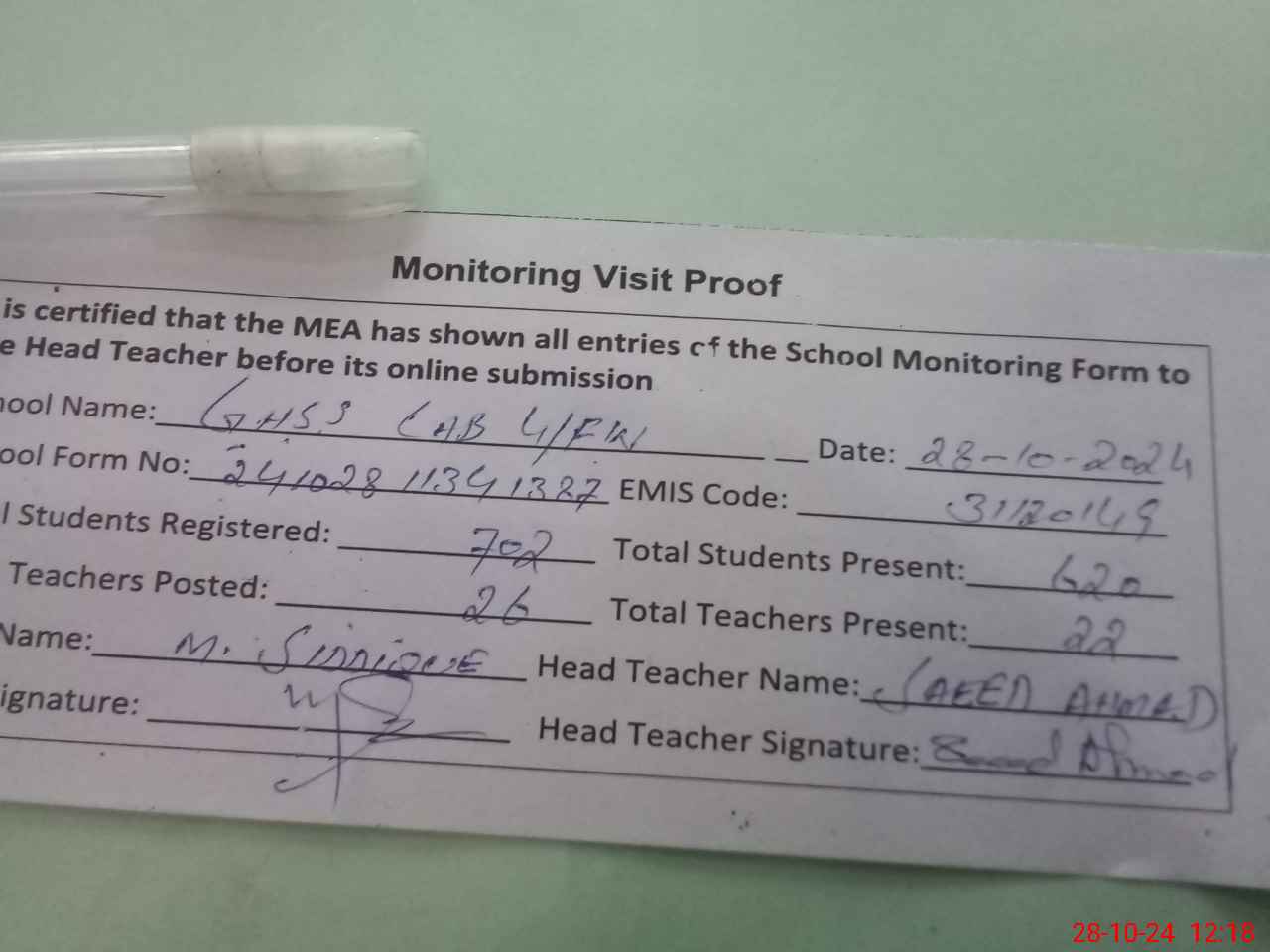 | EMIS Code: 31120149 | Name of School: GHSS LABORATORY 4/FW (ATTACH WITH QAED) CHISHTIAN | |||
