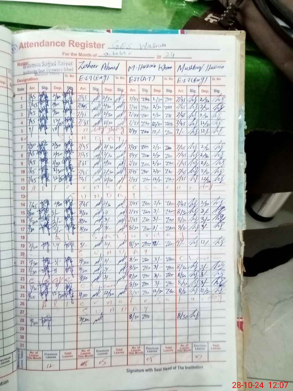 | CNIC | Full Name | Designation | R/C | Absence During Last Calender Month |