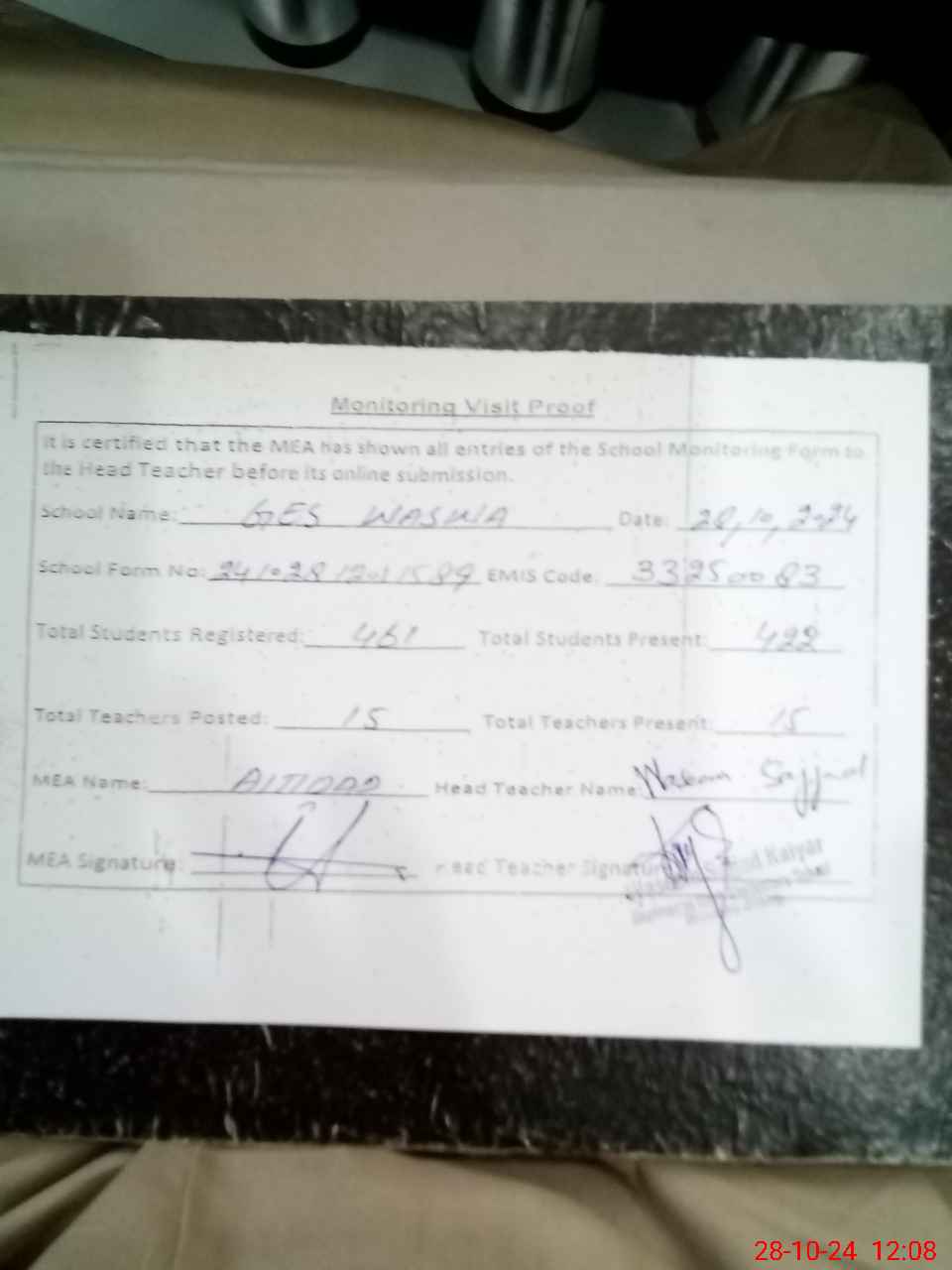 | Attendance Register | Head Teacher | MEA with School | Visit Proof |