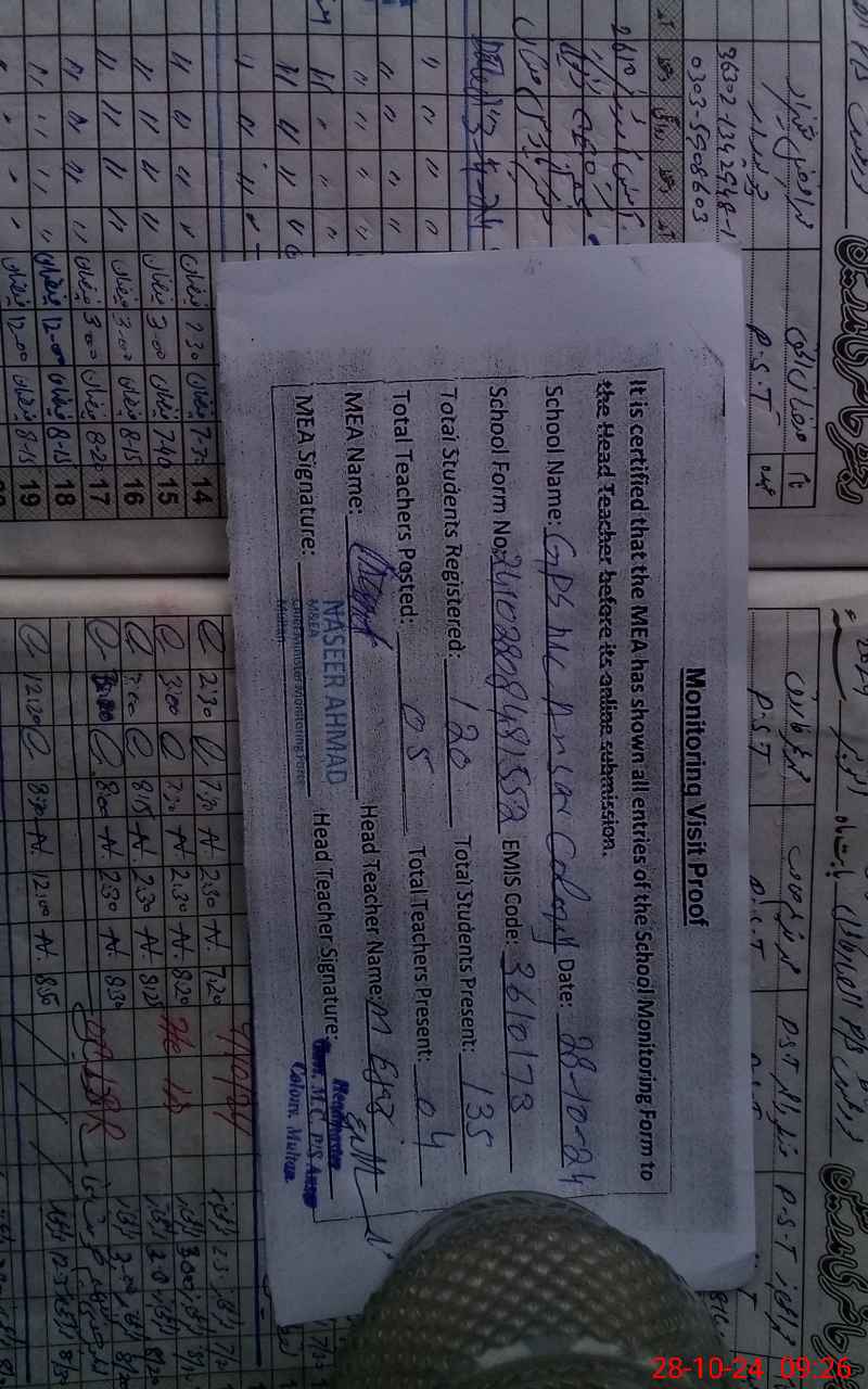 | Attendance Register | Head Teacher | MEA with School | Visit Proof |