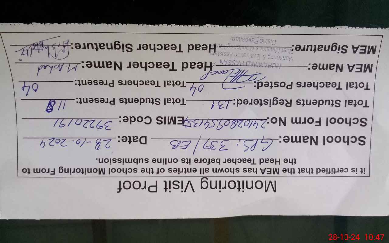 | Certified that this School was Inspected by the Undersigned MEA/DMO Today and the Information Stated Above is as Per Record. | |||||