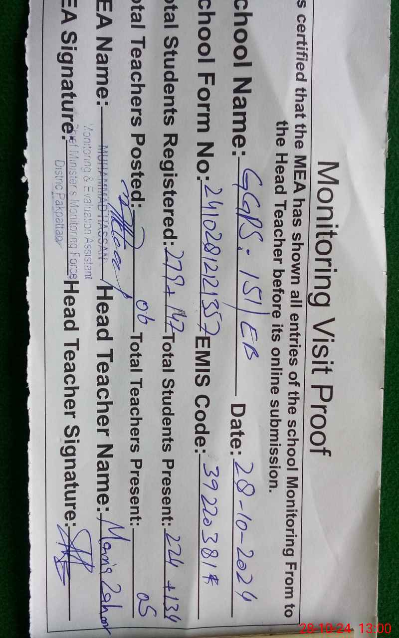 | EMIS Code: 39220381 | Name of School: GGPS 151 EB PO DILLOW WALA ARIFWALA | |||