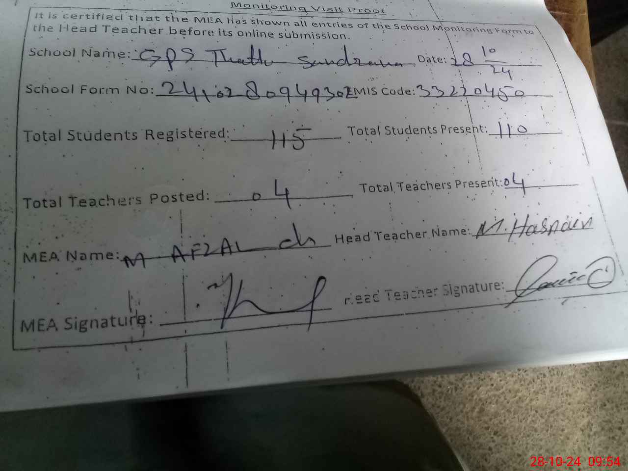| Attendance Register | Head Teacher | MEA with School | Visit Proof |