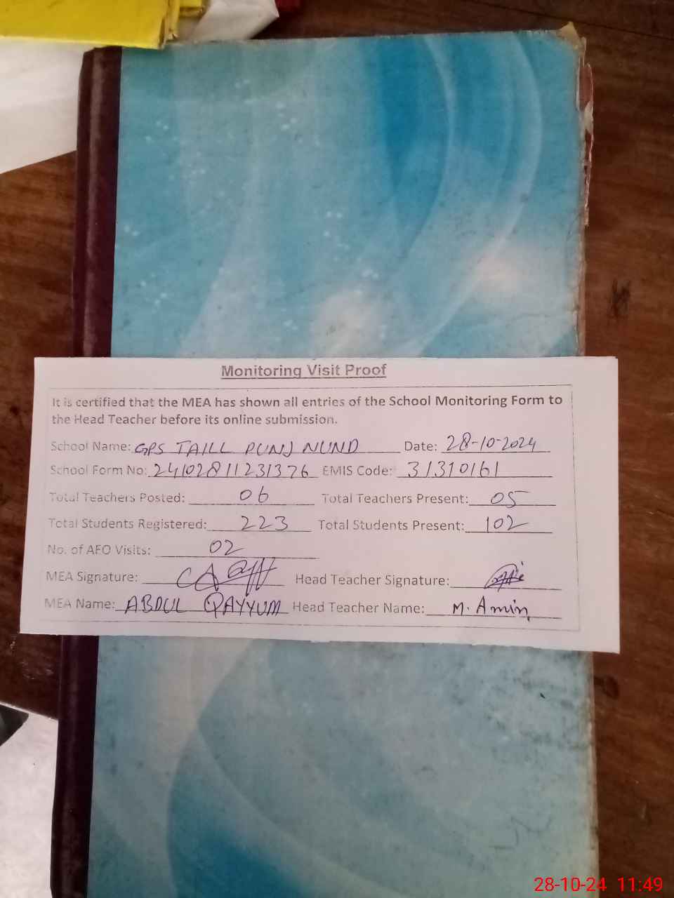 | EMIS Code: 31310161 | Name of School: GPS TAILL PUNJ NUND | |||
