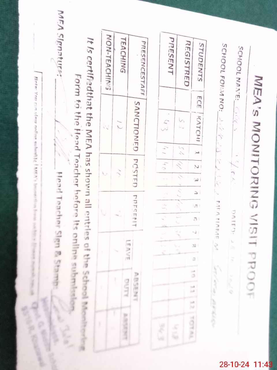 | Attendance Register | Head Teacher | MEA with School | Visit Proof |
