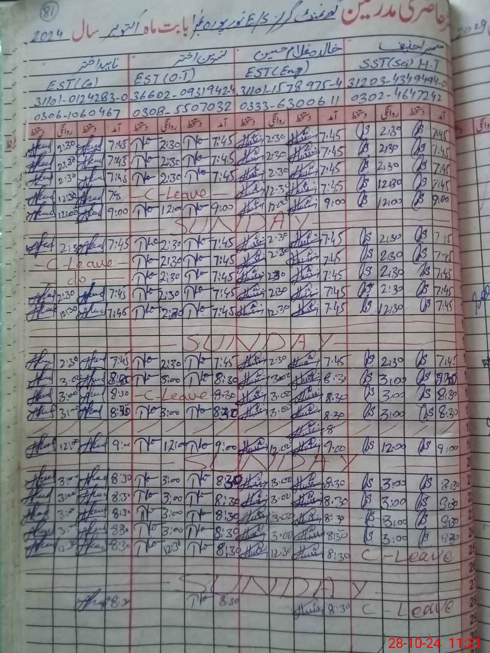 | CNIC | Full Name | Designation | R/C | Absence During Last Calender Month |
