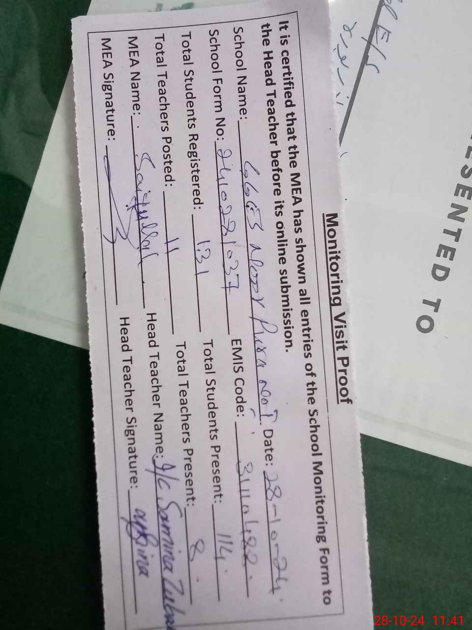 | Attendance Register | Head Teacher | MEA with School | Visit Proof |