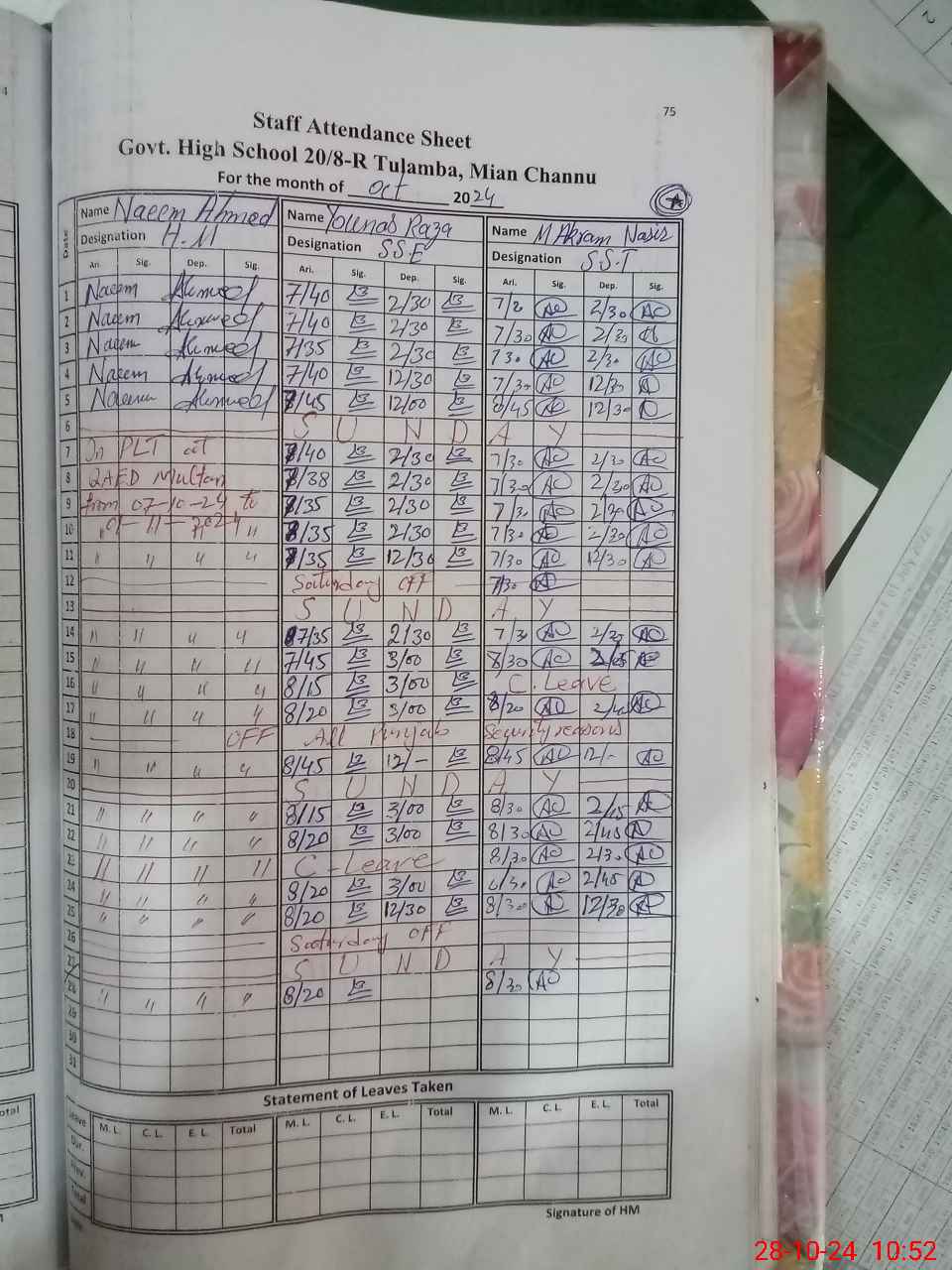 | Leave | Duty | Absent | Maternity | Medical | Ex- Pak |