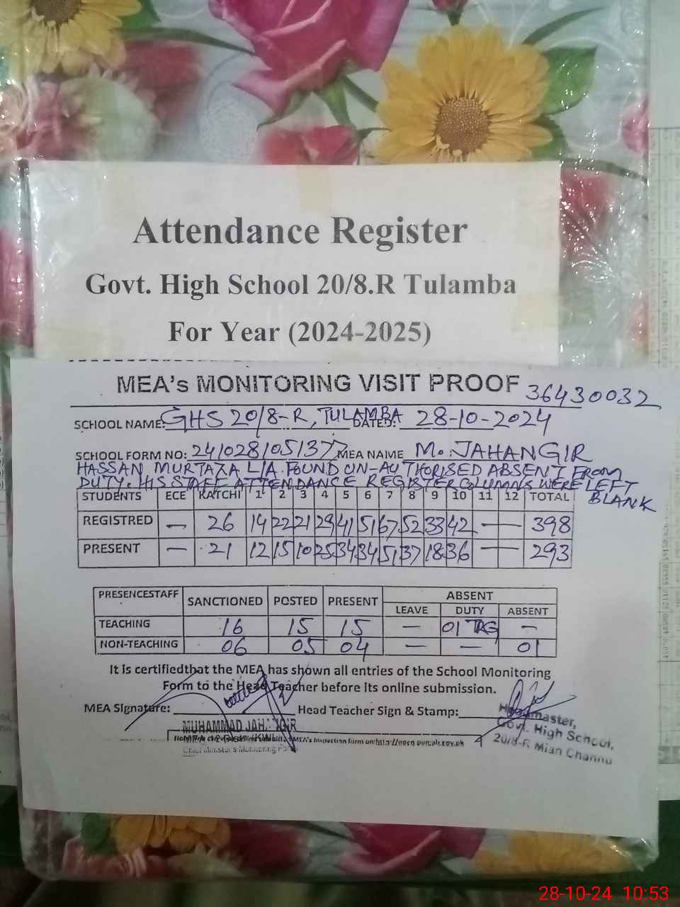 | Attendance Register | Head Teacher | MEA with School | Visit Proof |