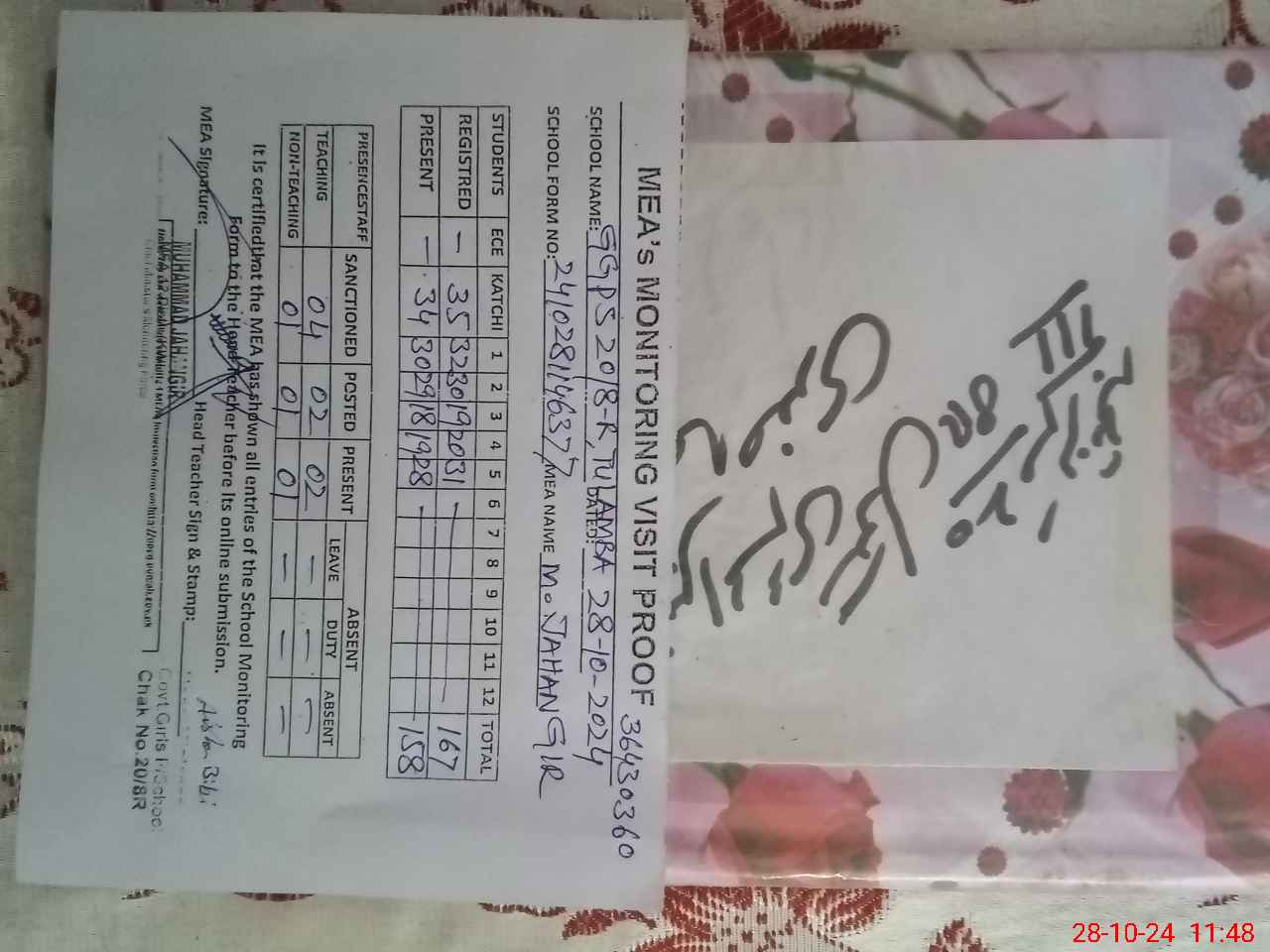 | Attendance Register | Head Teacher | MEA with School | Visit Proof |