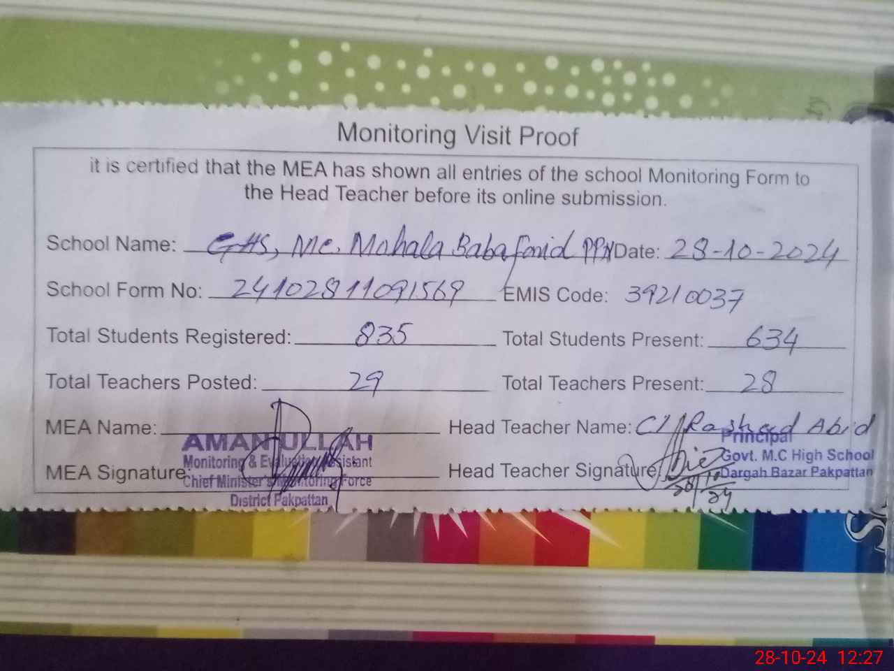 | EMIS Code: 39210037 | Name of School: GHS MC MOHALLAH BABA FARID | |||