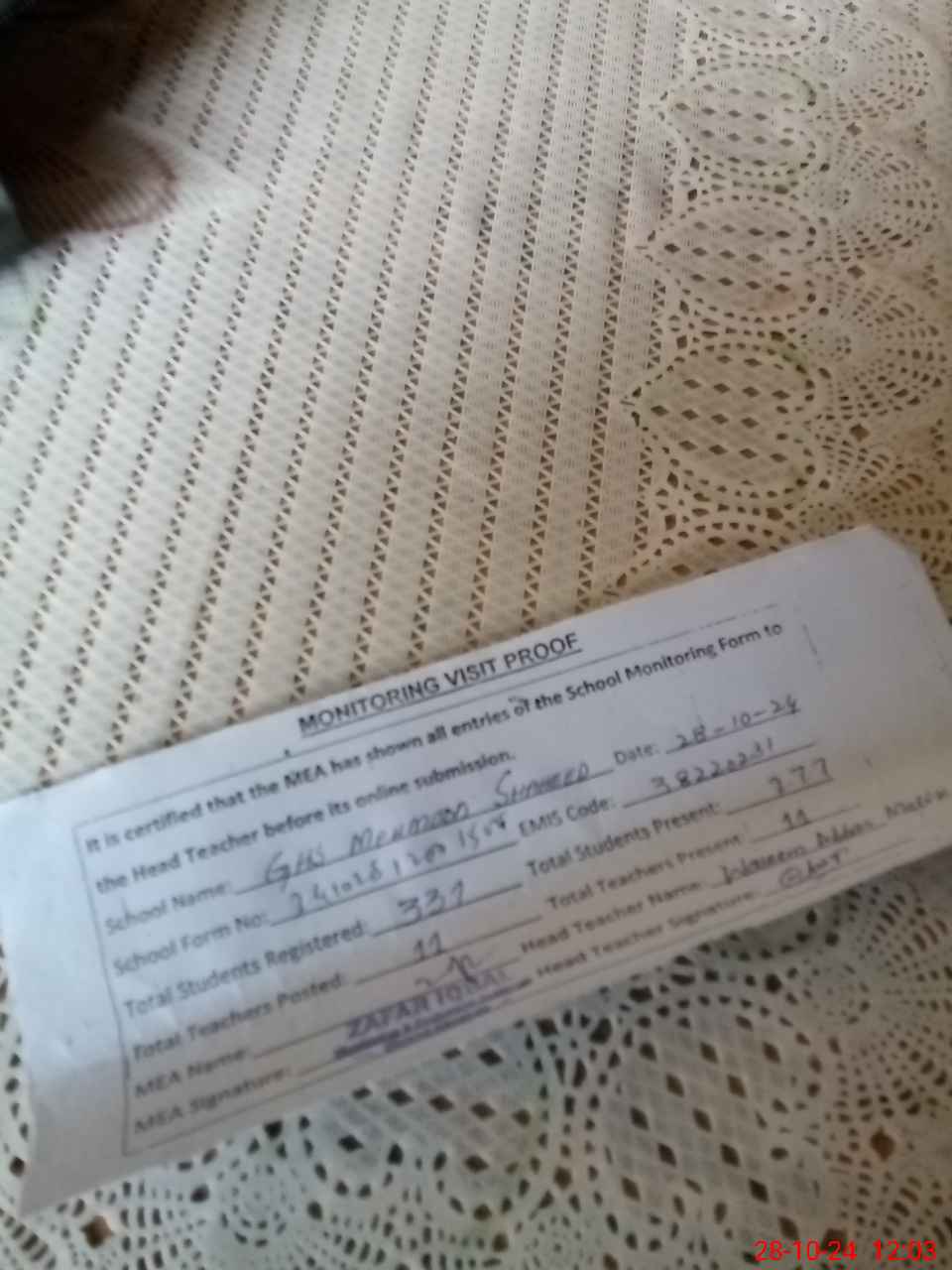 | Attendance Register | Head Teacher | MEA with School | Visit Proof |