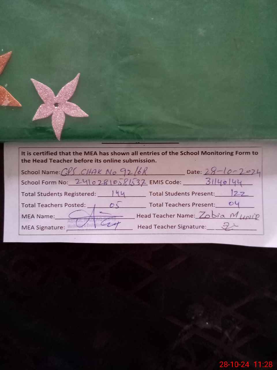 | Certified that this School was Inspected by the Undersigned MEA/DMO Today and the Information Stated Above is as Per Record. | |||||