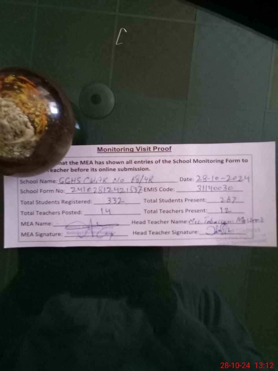 | Attendance Register | Head Teacher | MEA with School | Visit Proof |