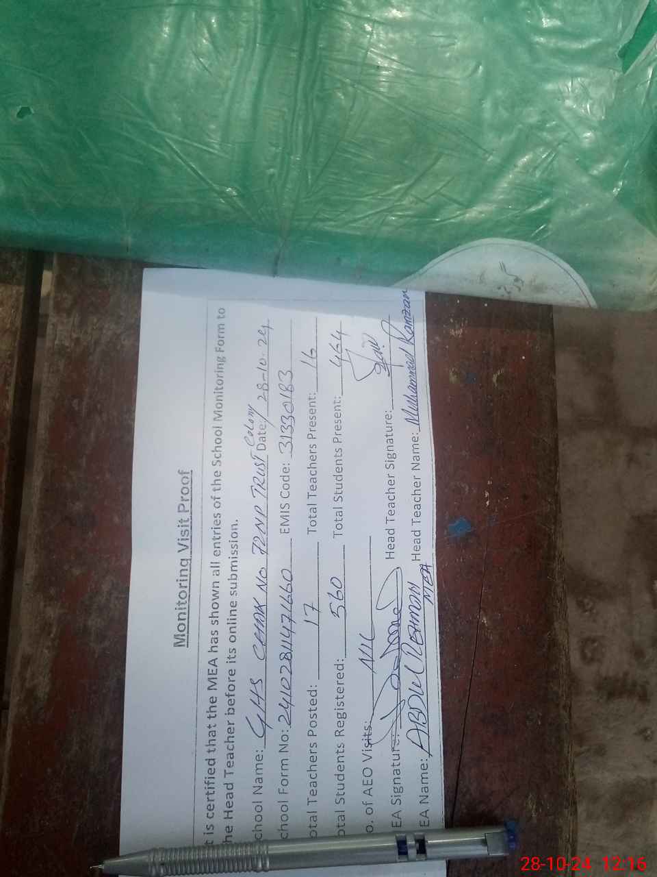 | Attendance Register | Head Teacher | MEA with School | Visit Proof |