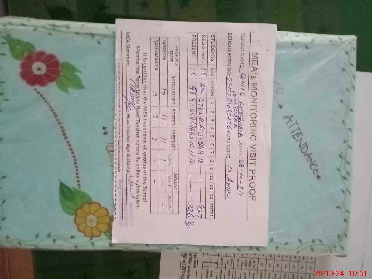 | Attendance Register | Head Teacher | MEA with School | Visit Proof |