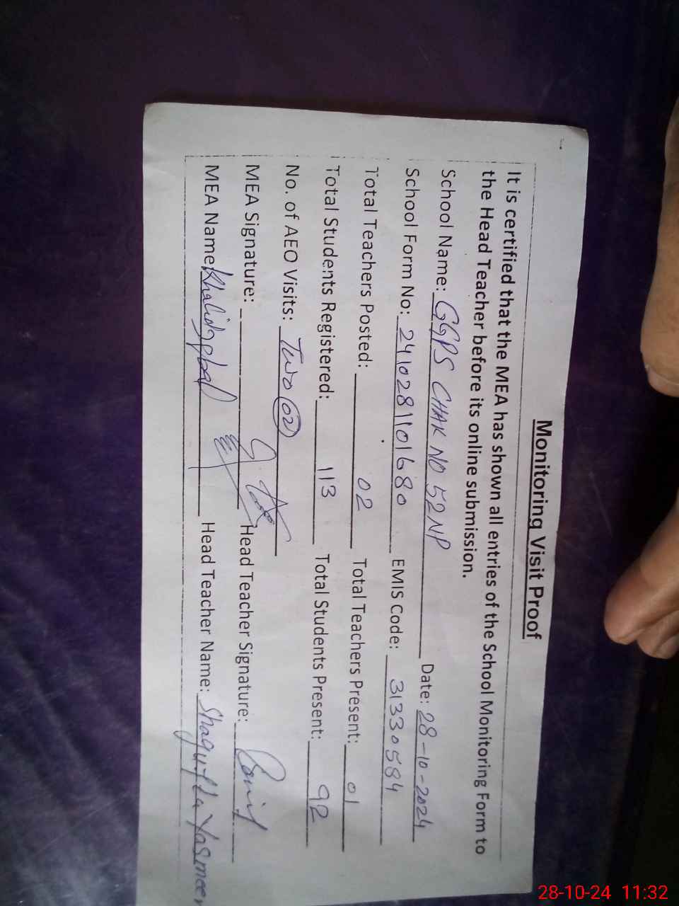 | EMIS Code: 31330584 | Name of School: GGPS CHAK NO. 52/NP | |||