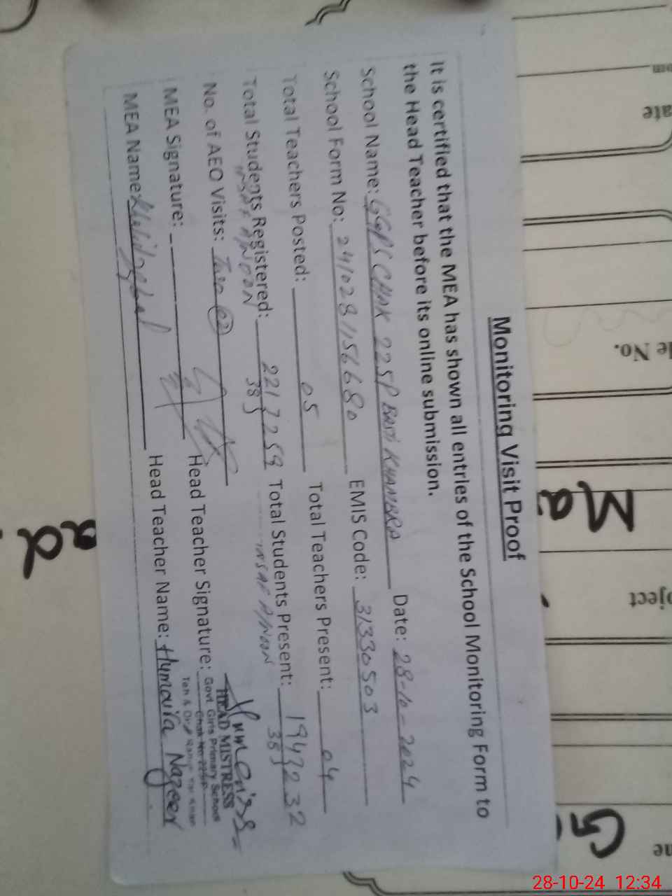 | Remarks (Use Separate Page if Required): Class verification is not updated on mea tab as per sis and school has insaf afternoon classes with students strength 38 and two classes are sitting in veranda | |||||