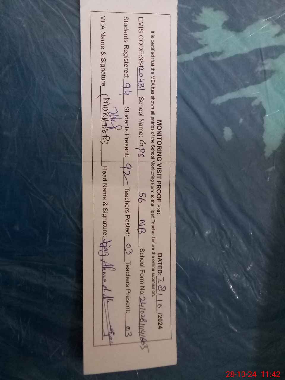 | Attendance Register | Head Teacher | MEA with School | Visit Proof |