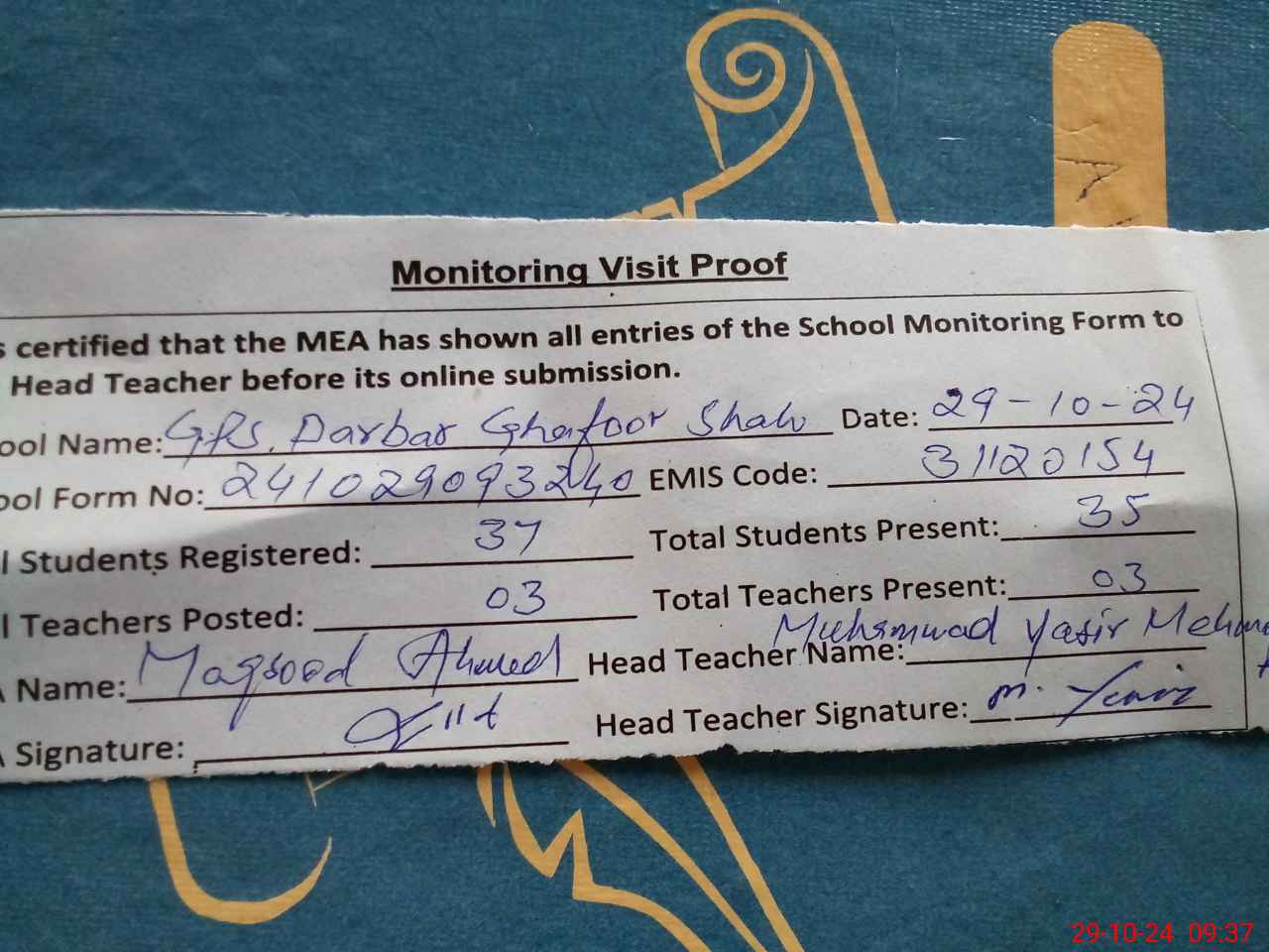 | Attendance Register | Head Teacher | MEA with School | Visit Proof |