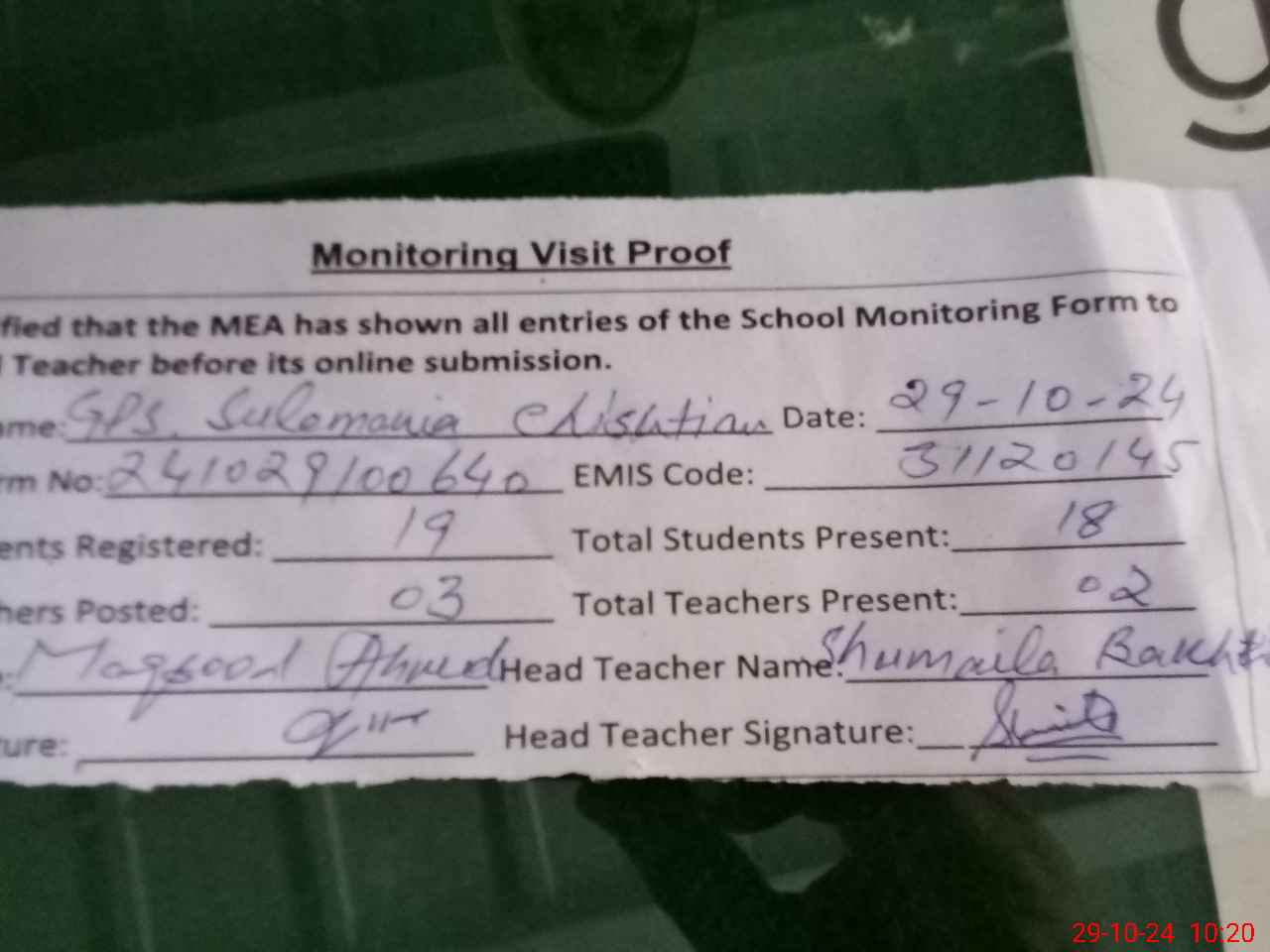 | EMIS Code: 31120145 | Name of School: GPS SULEMANIA CHISHTIAN | |||