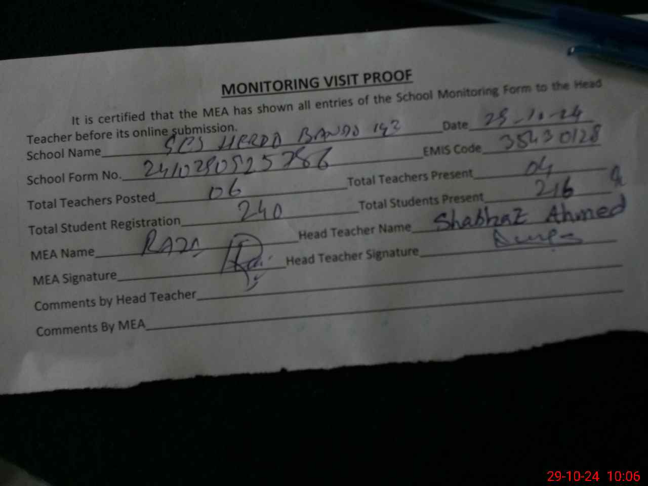 | Certified that this School was Inspected by the Undersigned MEA/DMO Today and the Information Stated Above is as Per Record. | |||||