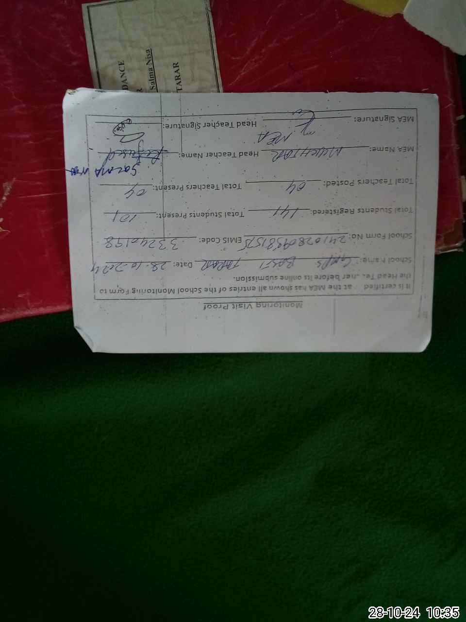 | Attendance Register | Head Teacher | MEA with School | Visit Proof |