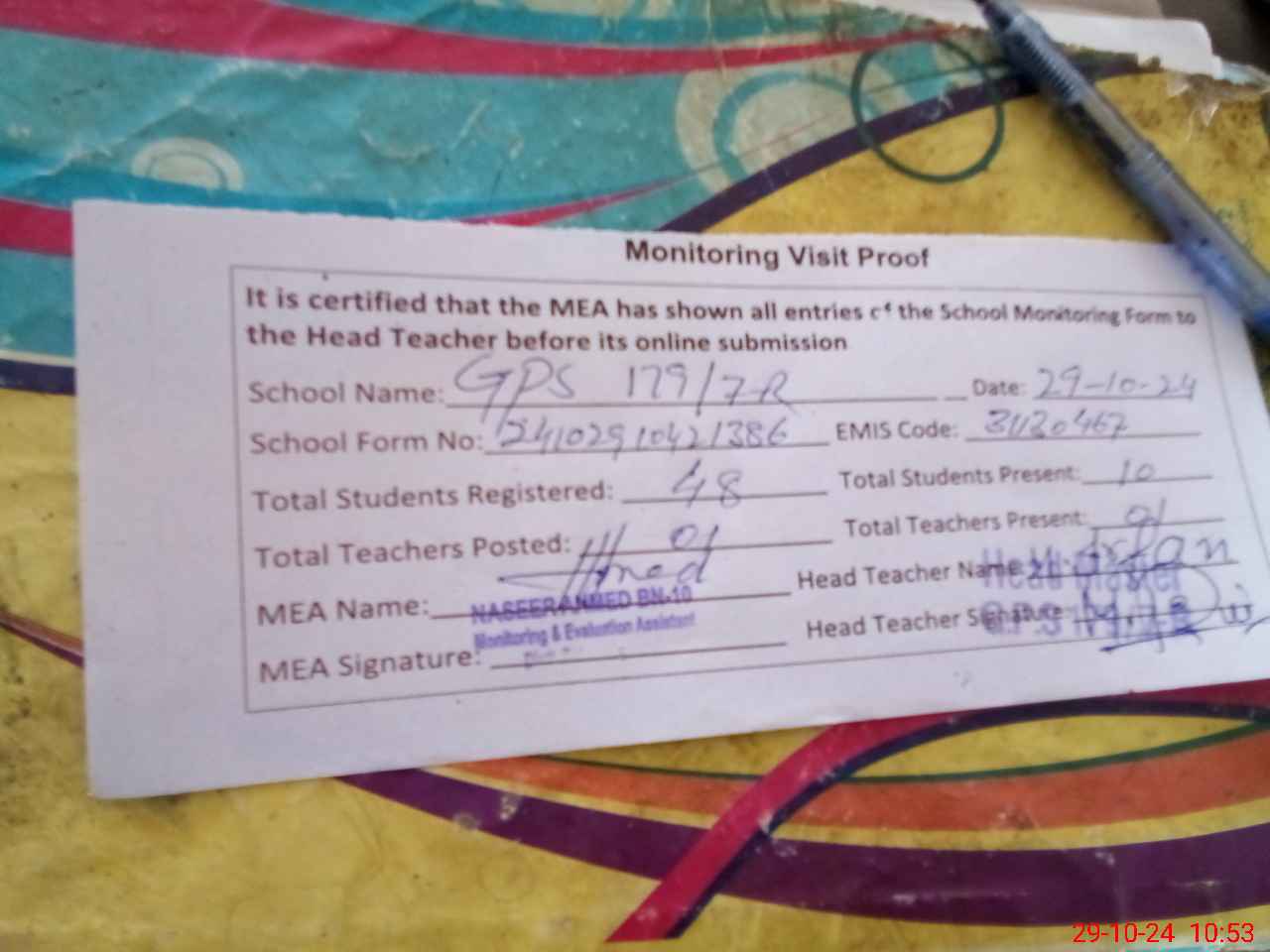 | Attendance Register | Head Teacher | MEA with School | Visit Proof |