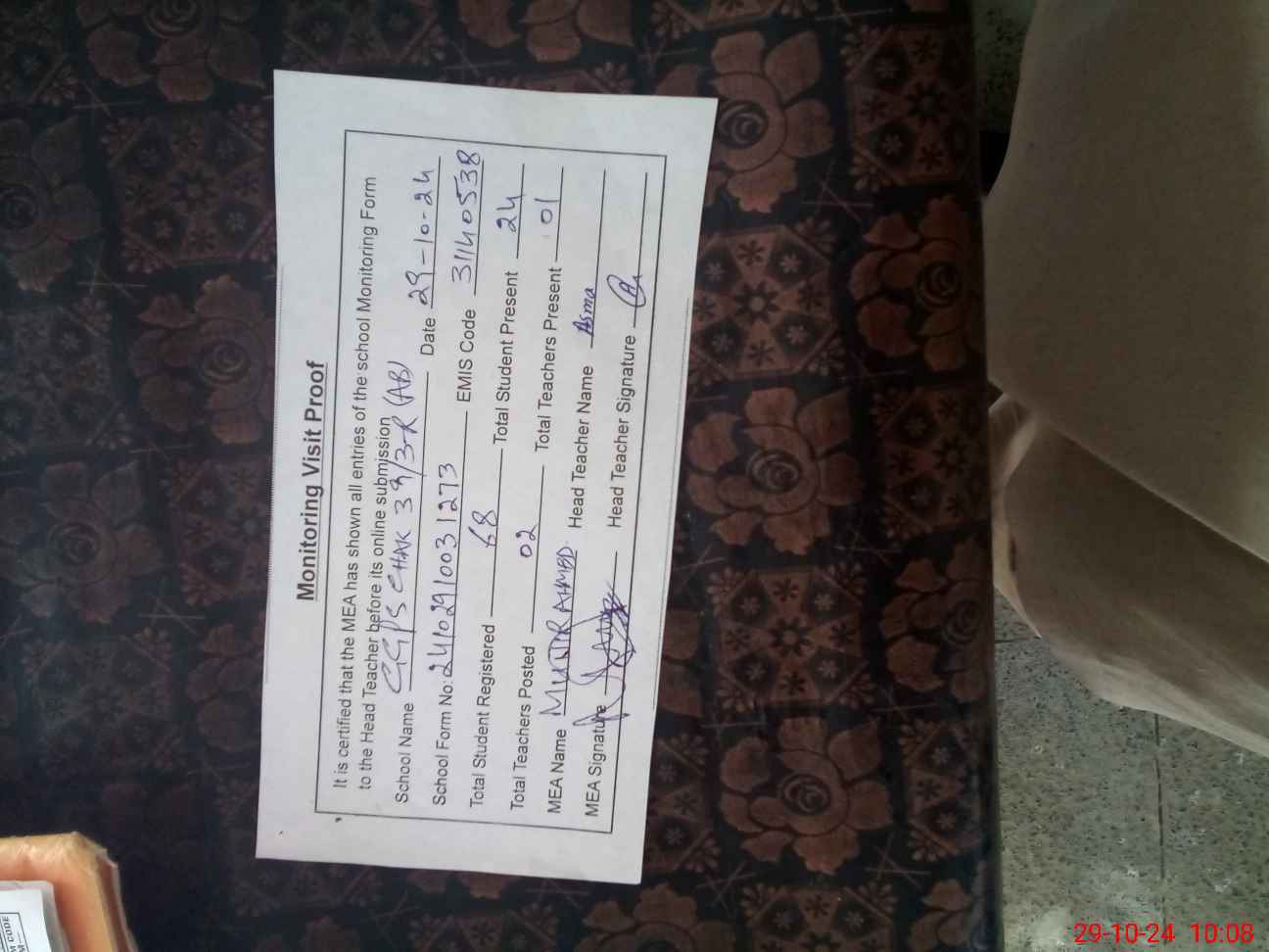 | Certified that this School was Inspected by the Undersigned MEA/DMO Today and the Information Stated Above is as Per Record. | |||||