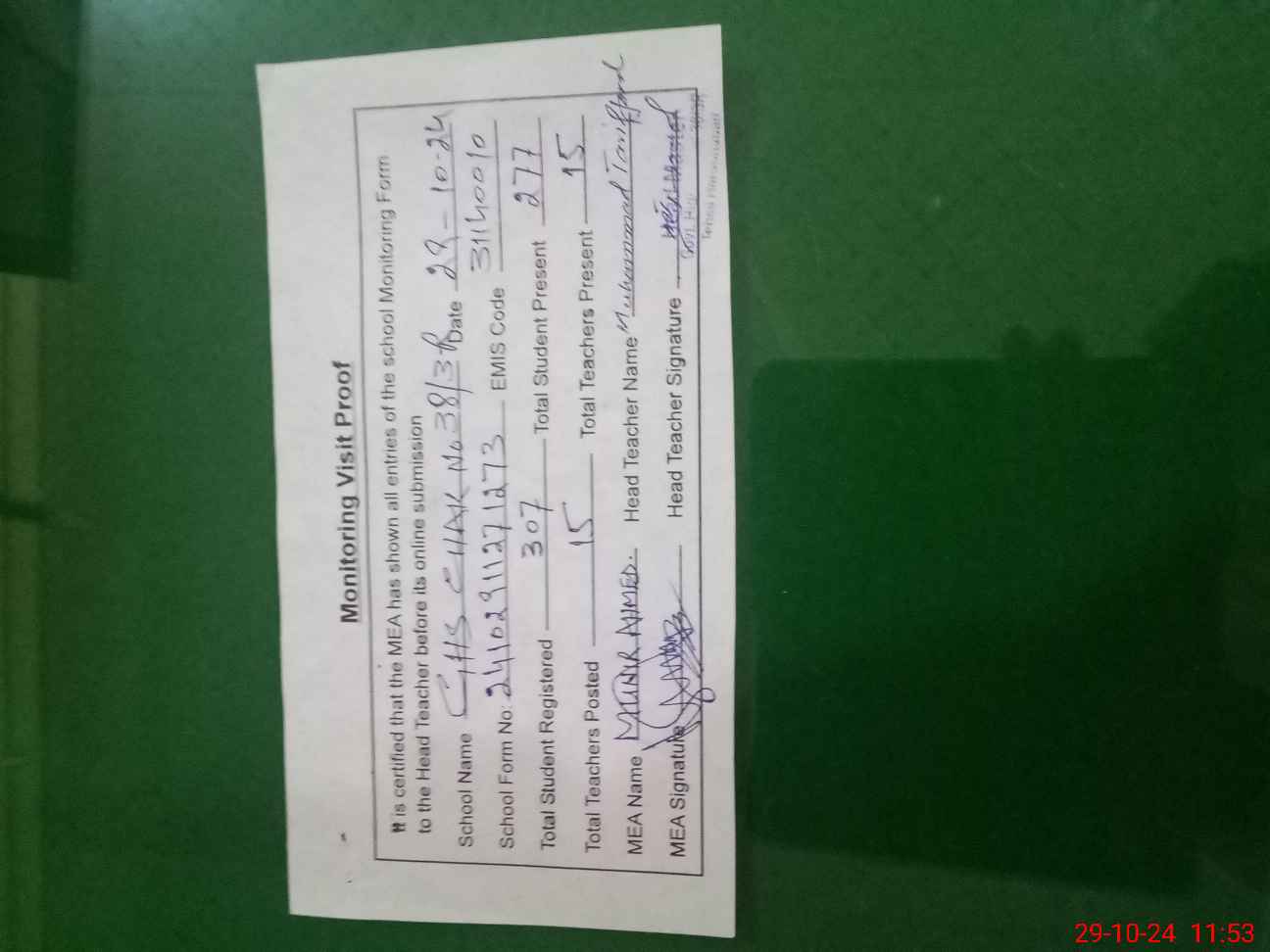 | Attendance Register | Head Teacher | MEA with School | Visit Proof |