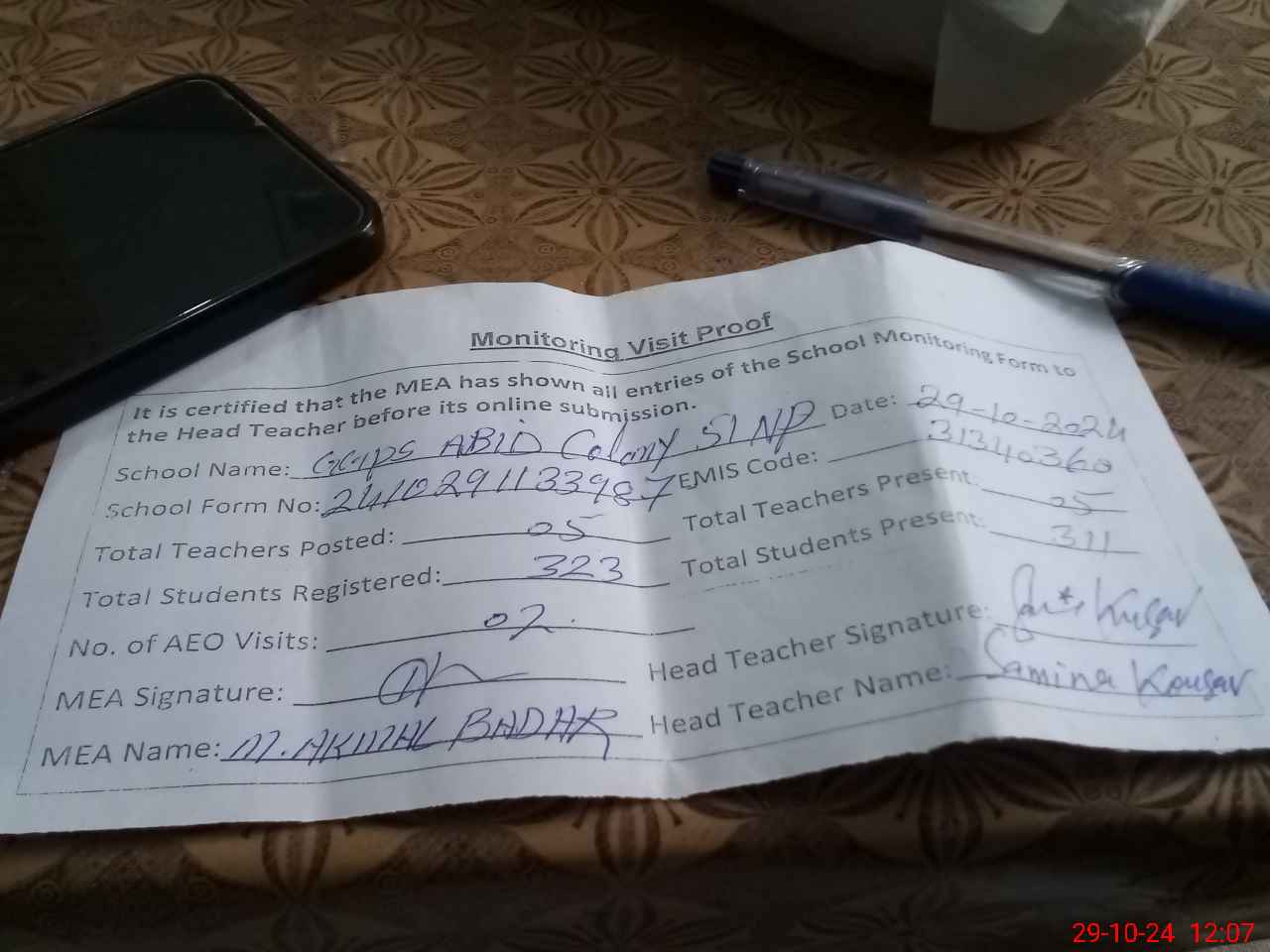 | Attendance Register | Head Teacher | MEA with School | Visit Proof |