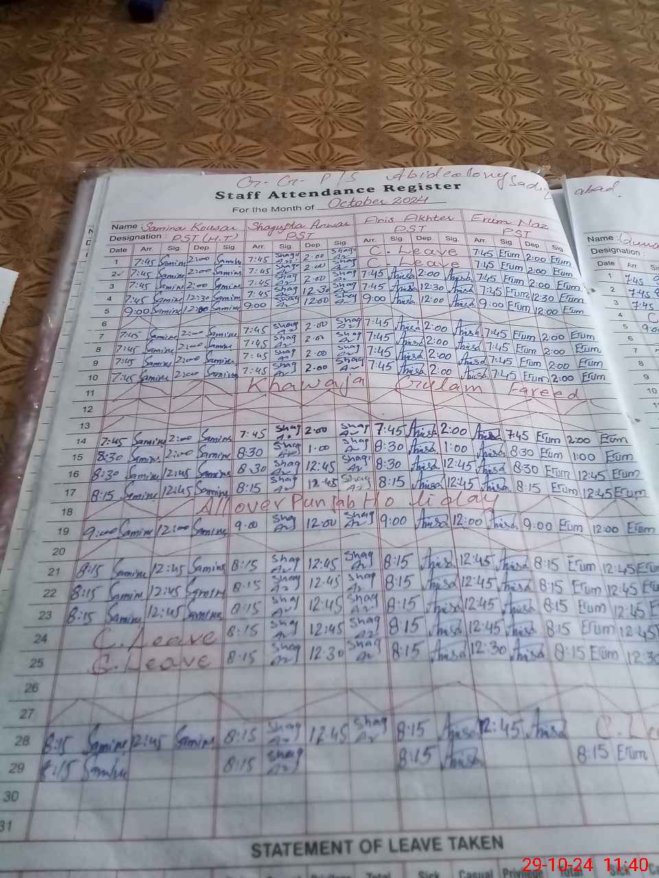 | CNIC | Full Name | Designation | R/C | Absence During Last Calender Month |