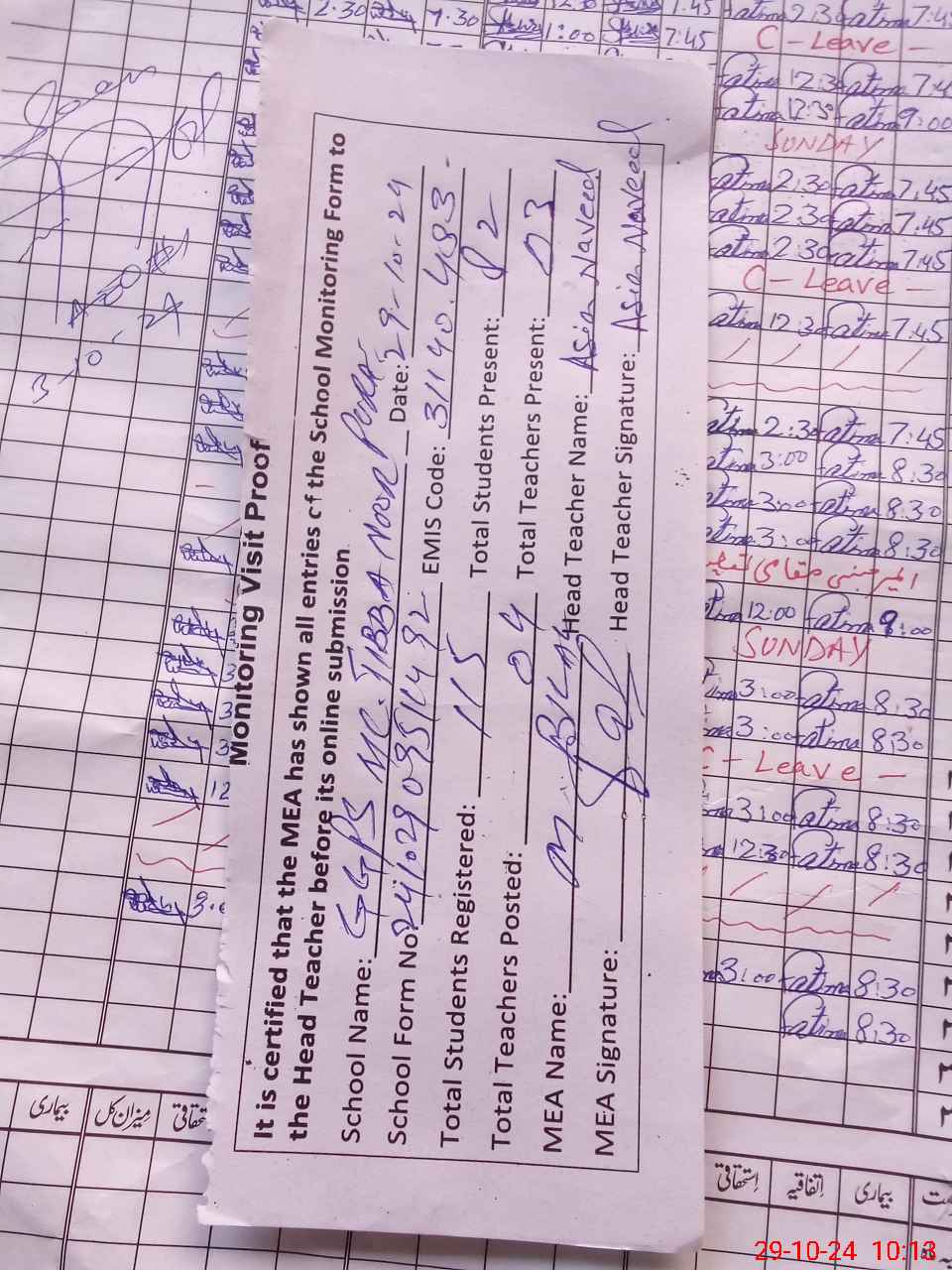 | Attendance Register | Head Teacher | MEA with School | Visit Proof |
