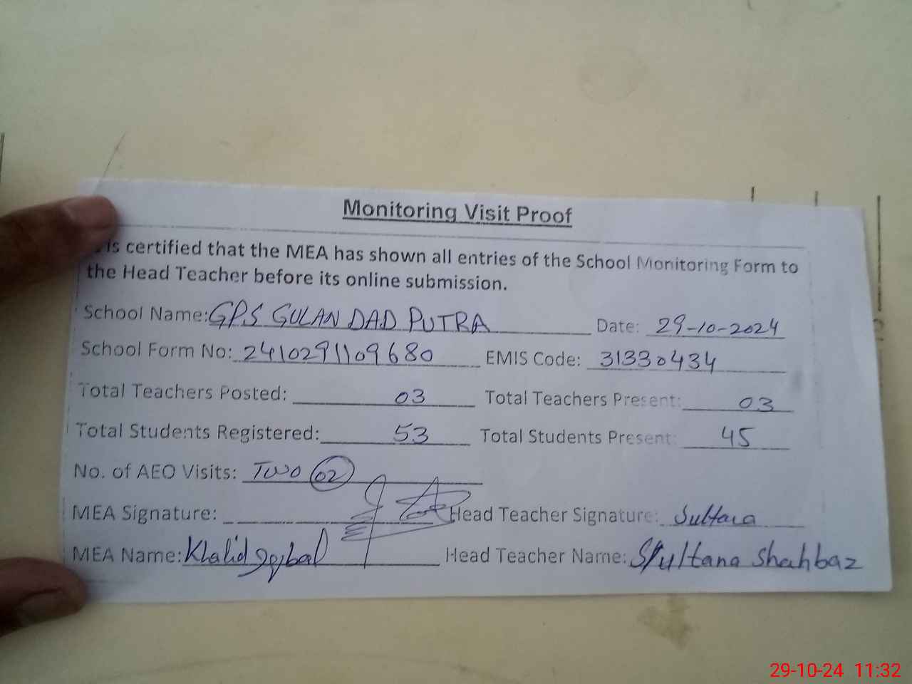 | Attendance Register | Head Teacher | MEA with School | Visit Proof |